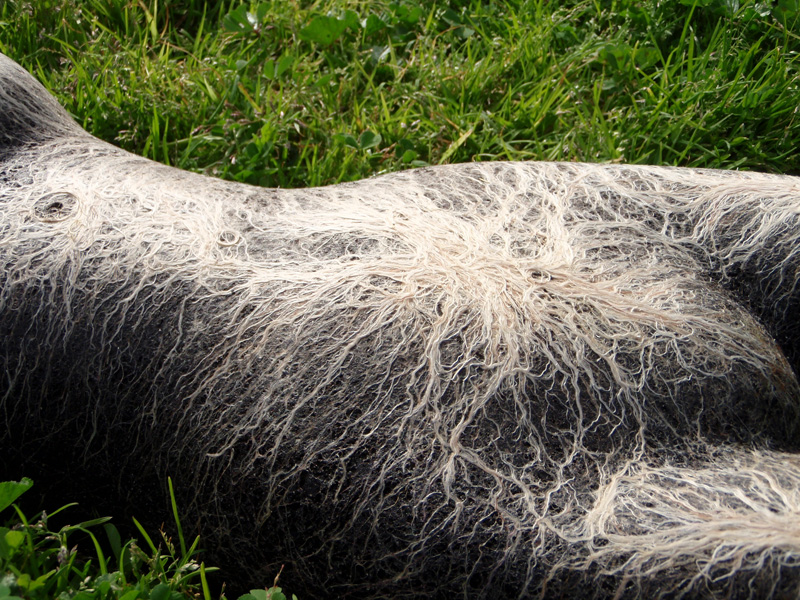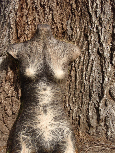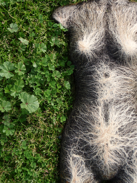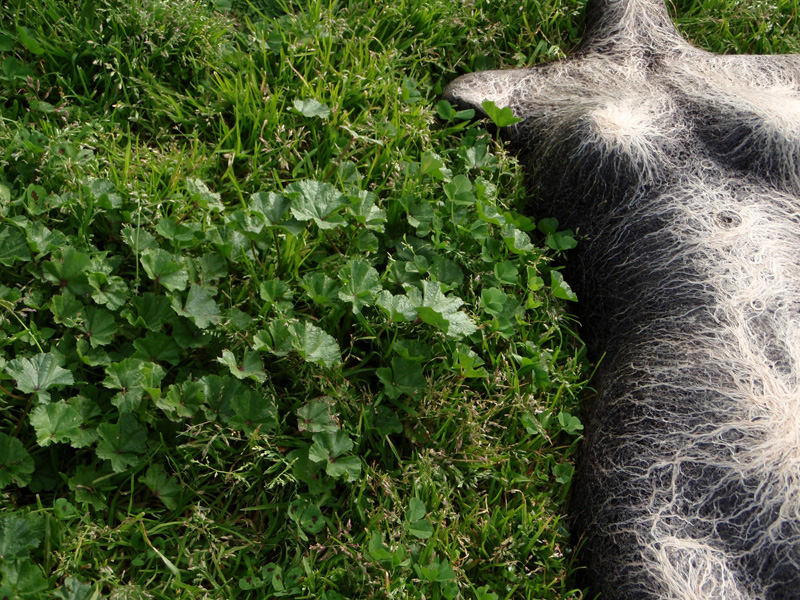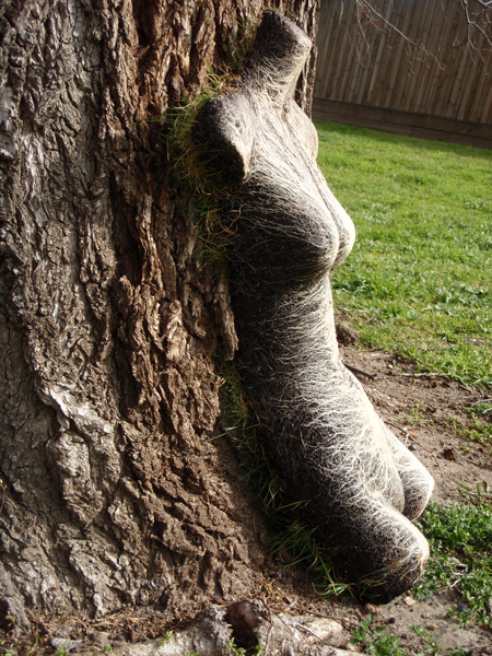 “The significant element of interest emerged as I flipped the mannequin over to reveal the hidden growth occurring inside [2.36-2.38]. As if caught by surprise, the root structure within the mould followed and contoured the body. The water pooled in the lowest regions of the mould, just as the blood does in a dead body, and as a result the roots had grown more rapidly and densely in those regions. The roots had formed a dense network over and through the body, working in the same way as a network of veins and arteries in the human body would deliver blood and other cellular nutrition. The roots became the binding agent – the connective tissue in a body. The soil and seeds had become another body, another life, a reiteration, or ghost, of a life past.”