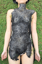 “The issues of rebirth through death, natural burial, and regeneration into the landscape were integral to a second project series undertaken as part of this doctoral research: the Body Moulds. These began as a simple proposal to create ‘bodies’ that merged with the landscape within a fashion context, to then become a large series of iterations or ‘cycles.’ These moulds then moved from the fashion realm into the sculpture domain, where several material tests were conducted and a number of different types of mould shapes were experimented with, each engaging with slightly different dialogues.”